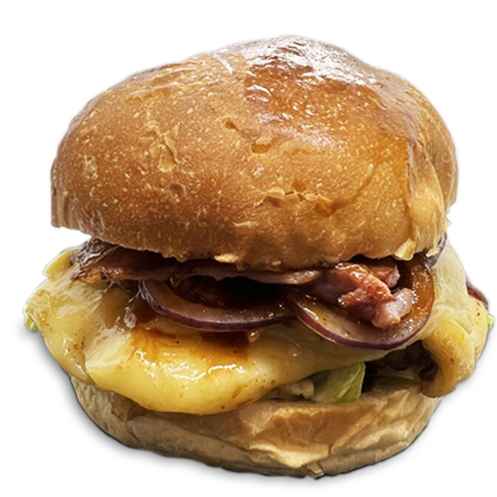 Pain artisanal, steak haché charolais, bacon, fromage à raclette, oignons rouges, salade, et sauce barbecue.