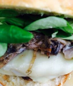 Pain artisanal, steak haché charolais, emmental, champignons frais cuisinés à la crème, mâche.